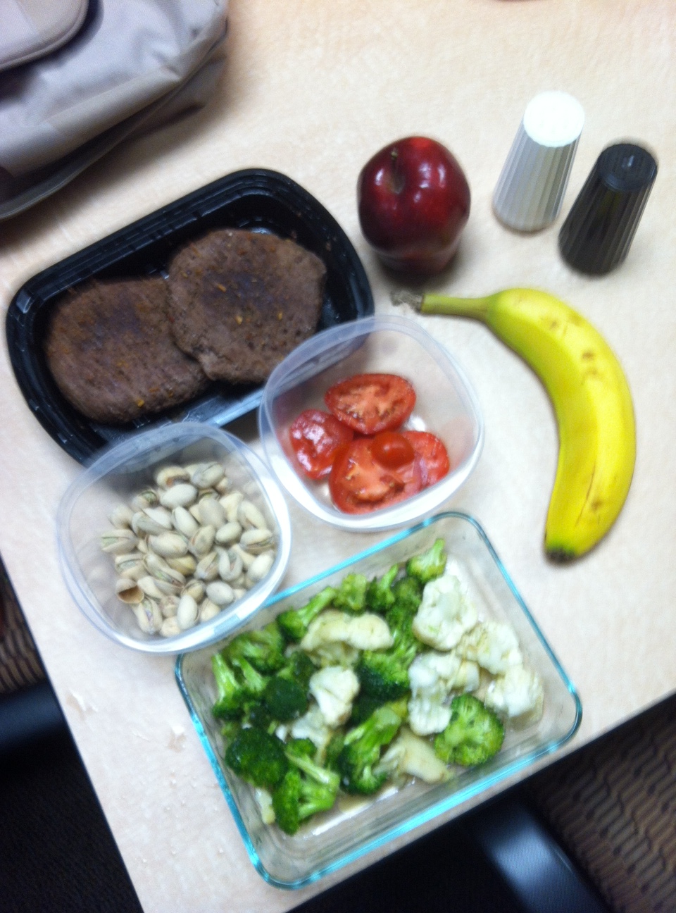 hamburger, banana, salad,apple,tomato,nuts, pistachios,