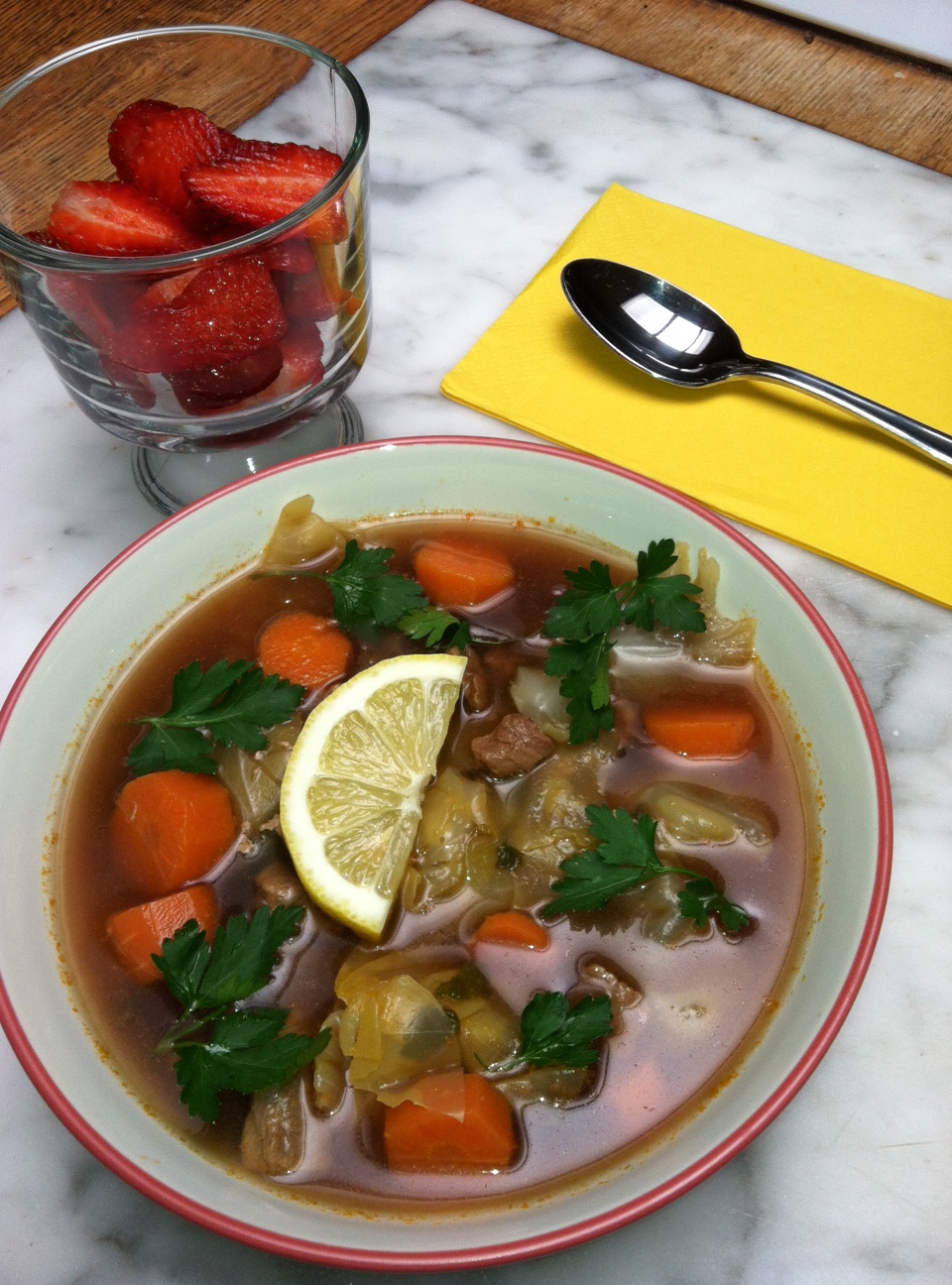 Add raw meat to the water in a large pot and boil gently for 30 minutes. Then add tomato sauce, carrot, salt, pepper, parsley, and cabbage. Bring to boil over medium heat and them simmer for 45 minutes.
