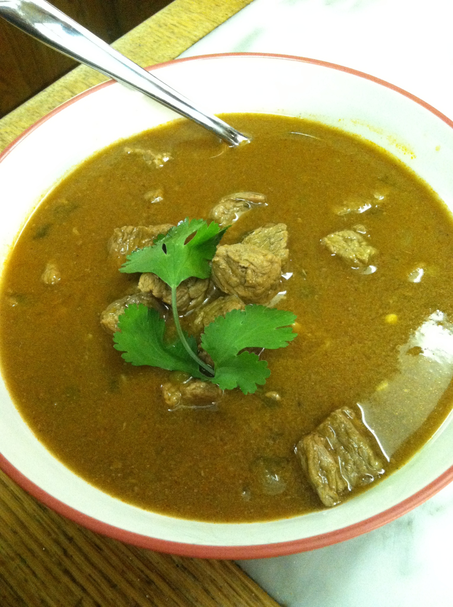 Stoup first. In a frying pan or electric skillet, place the stew meat, cilantro, garlic, bell pepper, onion, and cook over medium heat (350º F or 177º C) until the meat is done. Then add the tomato sauce, two cups of the water, one tsp of the salt, and pepper to taste. Simmer for two hours, then add a half cup water to replace evaporation loss.