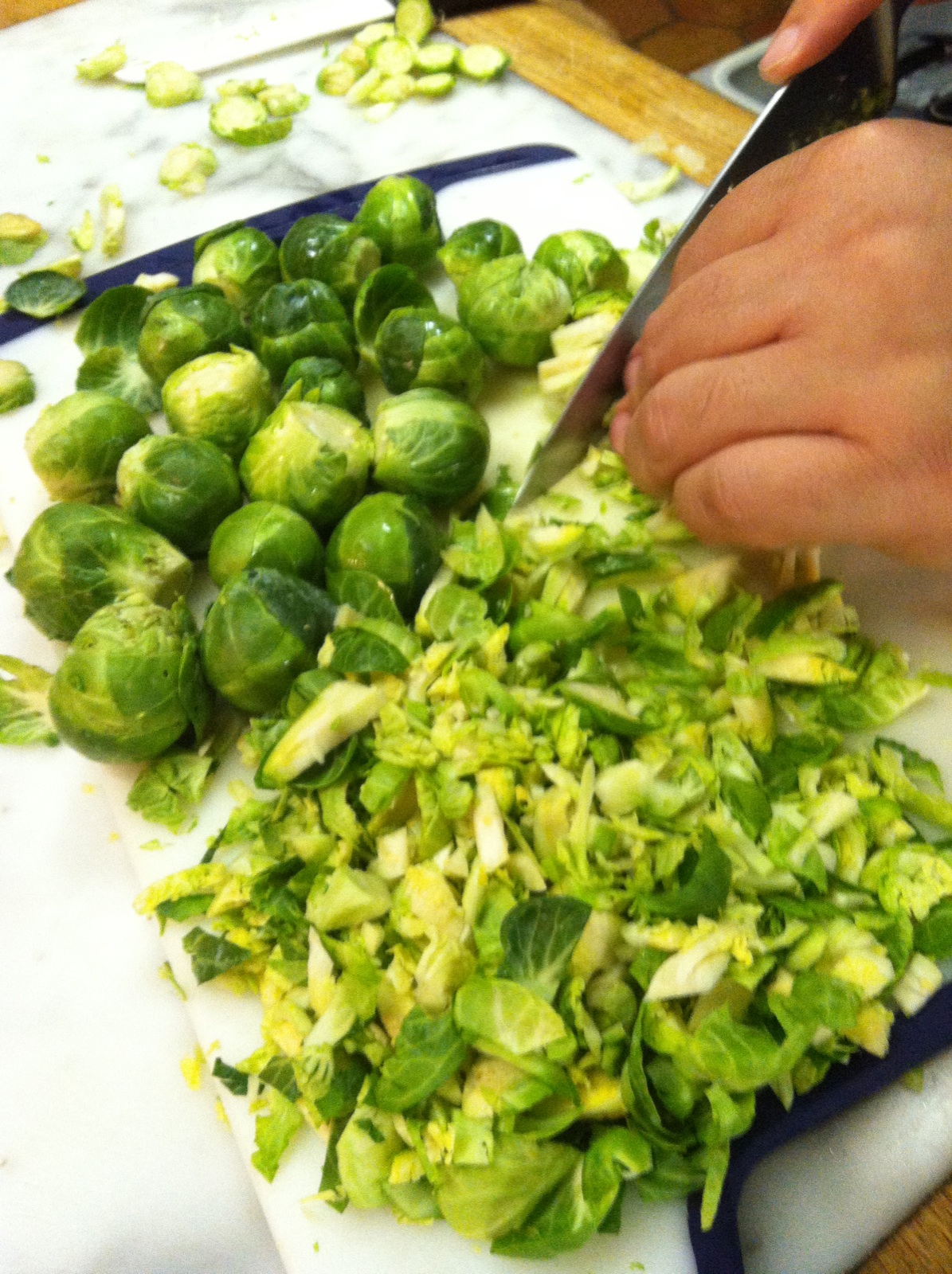Next do your Brussels sprouts prep (shredding). It will take a few minutes to shred it with a knife. Set those aside.