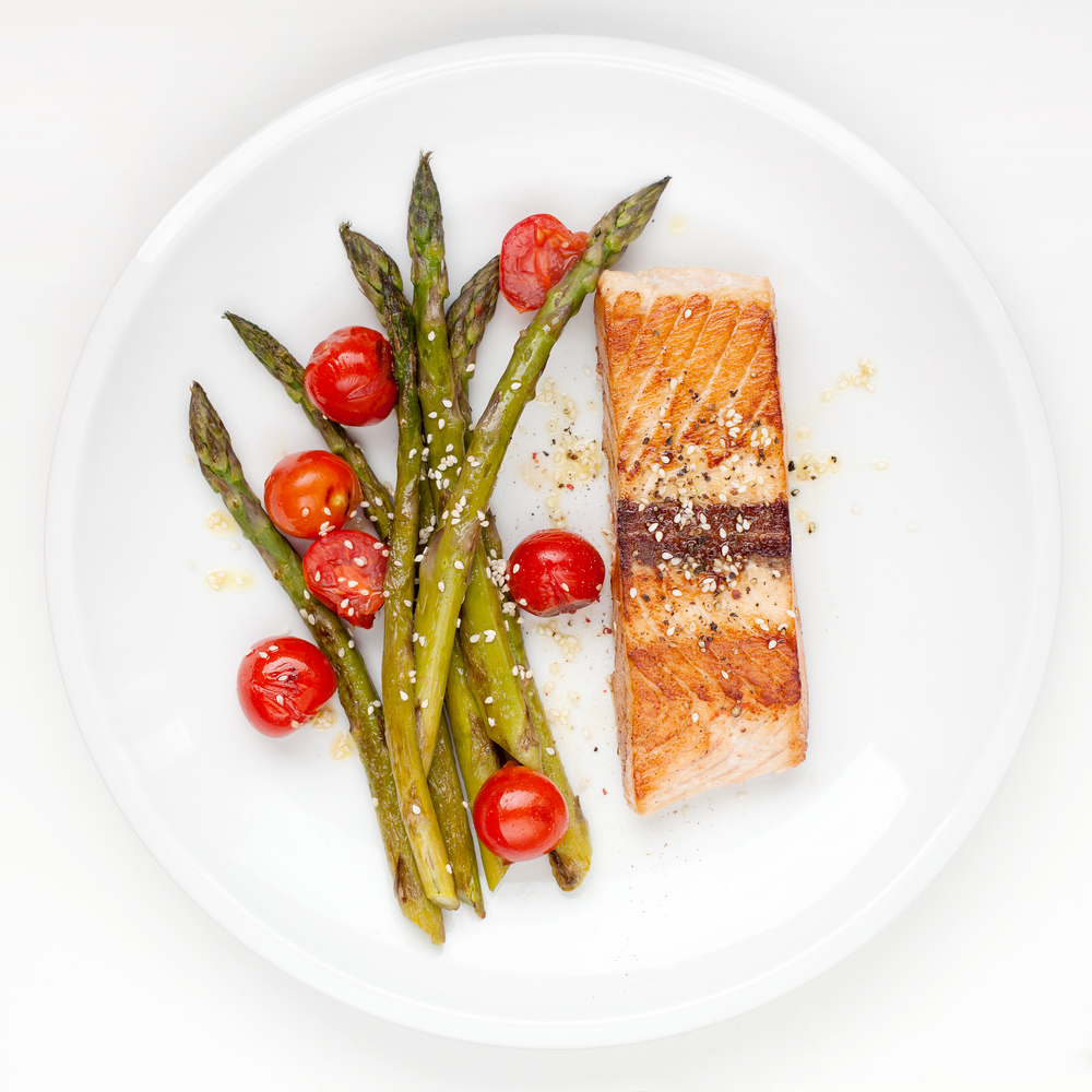 salmon, asparagus, tomatoes, tomato, food