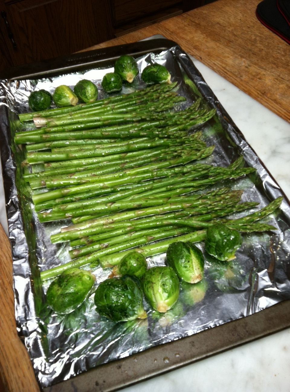 I dumped all ingredients into a bowel and mixed thoroughly to ensure the sprouts were coated with oil.