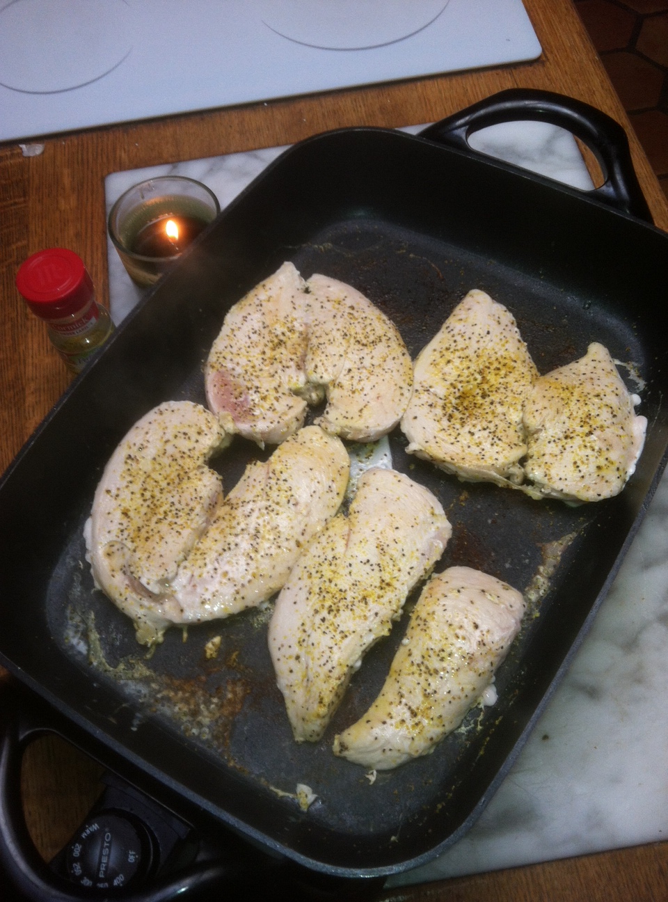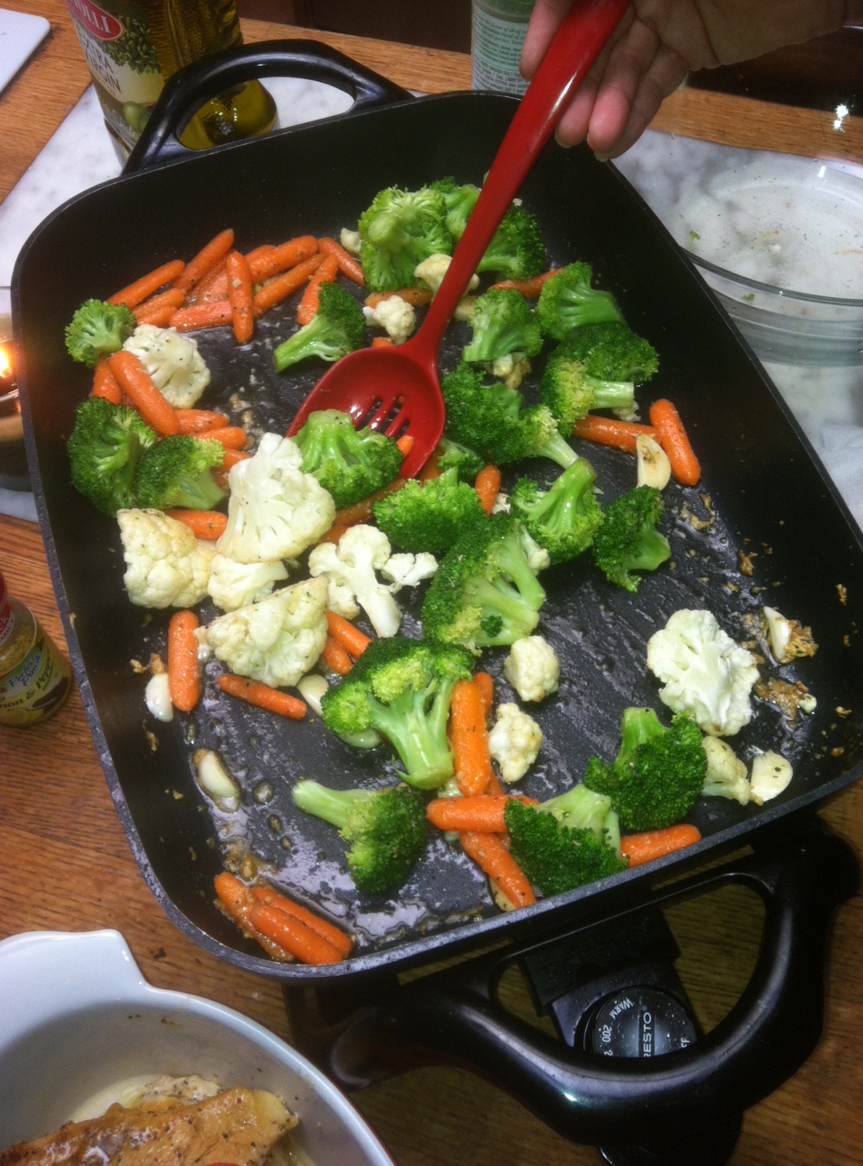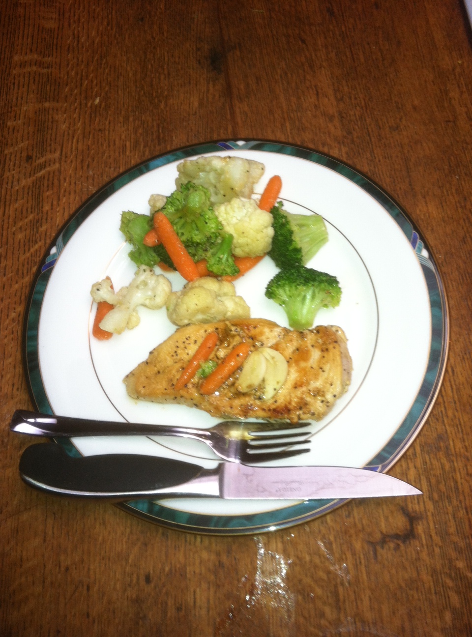 Start on the vegetables about ten minutes after the fish go in the oven. Put the broccoli, cauliflower, and carrots in a microwave-safe dish, add about four fl oz (120 ml) of water, and microwave (covered) on high for four minutes. If you don’t have a cover, just use a water-moistened paper towel. While they cook, heat 2 tbsp (30 ml) of the olive oil in a medium-sized pan over medium heat (with one clove of diced garlic) for a couple minutes to release the garlic flavor. Drain the water off the microwaved vegetables, then sauté them in the olive oil pan for a couple minutes, stirring frequently. Add your commercial vegetable seasoning when you start sautéing or at any point thereafter, even at the table.
