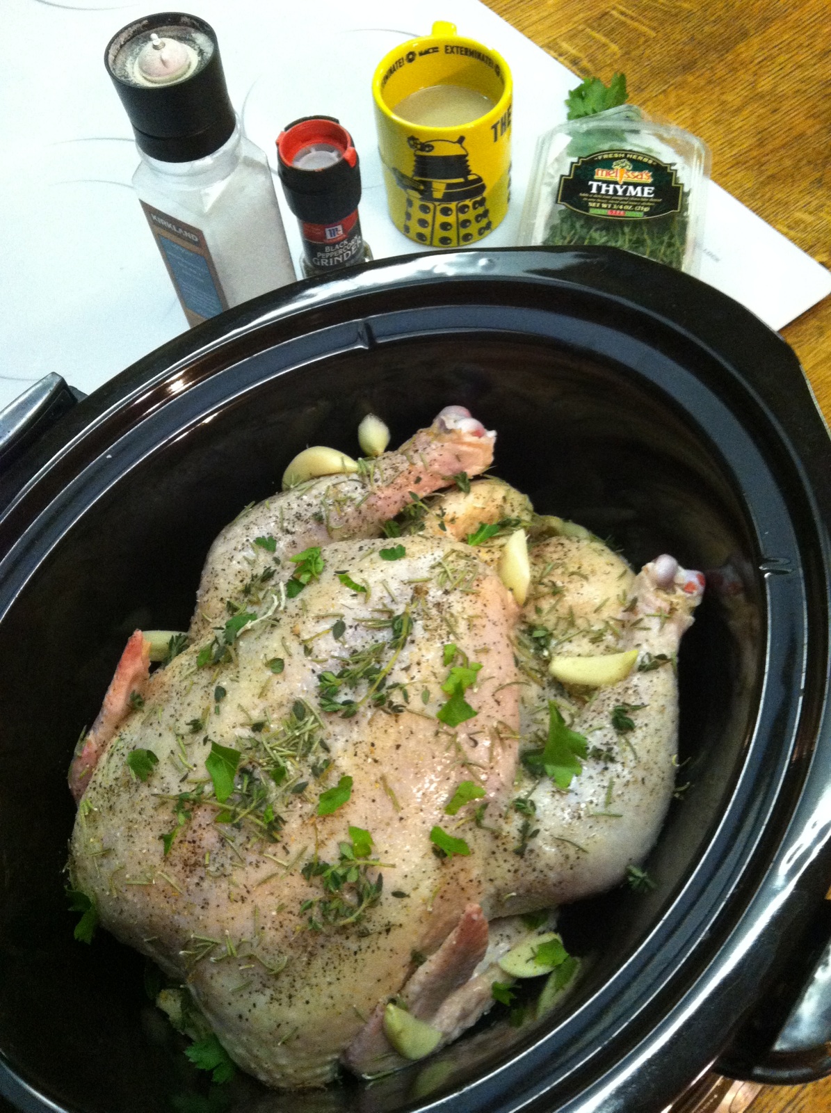First, the slow-cooker chicken. This cooks for eight hours, so you’ll want to start in the morning. Place the cut onion in the bottom of the cooker. Do what you want with the chicken giblets (neck, liver, heart, gizzard), even eat them after cooking. The coyotes don’t care if cooked or not. Rub 1 tbsp (15 ml) of the olive oil onto the top of the chicken, then place in the cooker on the bed of onion. Cut three of the garlic cloves into thirds and drop into the cooker. Add the chicken broth to the cooker. Sprinkle the thyme leaves on top of the chicken, along with 1/4 tsp (1.2 ml) of black pepper and 1/4 tsp (1.2 ml) salt. Sprinkle the rosemary and parsley into the cooker. Close the lid and cook on low heat for eight hours.