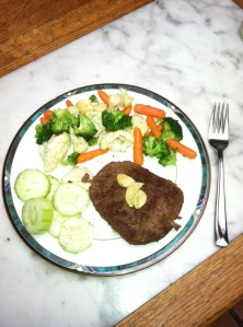 My first Parker Paleo Diet meal: sautéed mixed veggies and pan-fried chicken breast