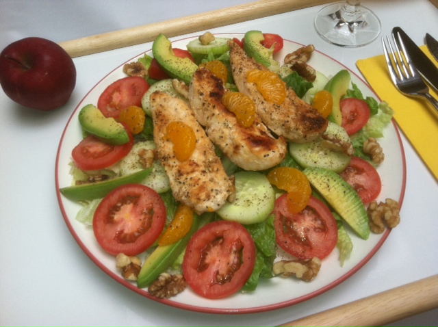 Place the lettuce and spinach on a plate then add the cucumber, avocado, tomato, cooked chicken, walnuts, and mandarin orange wedges on top. Drizzle two or three tbsp of the vinaigrette over it (nutritional analysis assumes three). Enjoy.