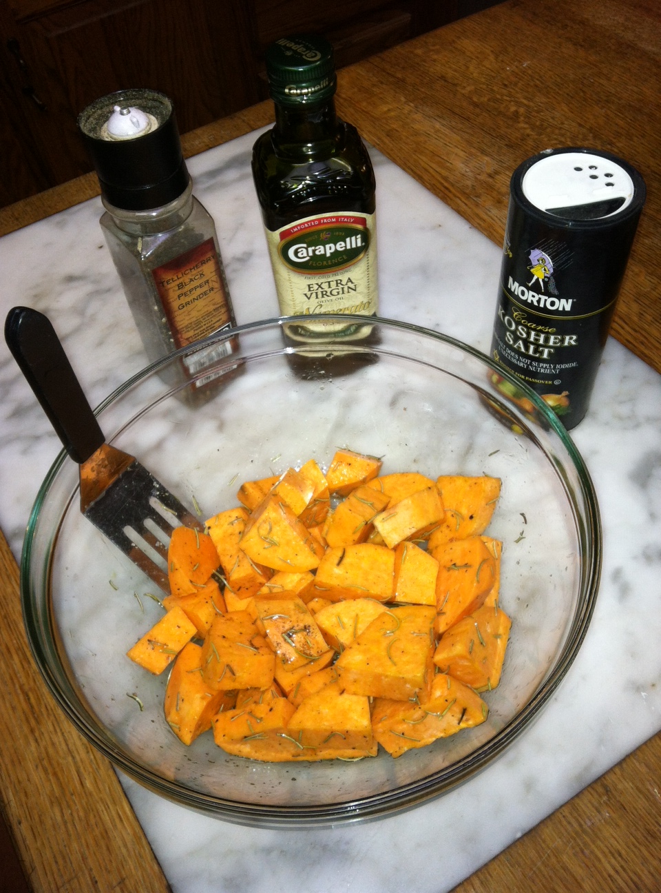 Sweet potato chunks brushed with olive oil, salt, pepper, and rosemary. Ready for the oven.